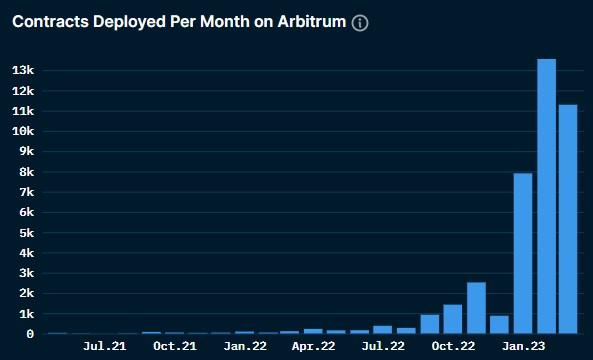 This is an indicator that can be used to gauge whether the ecosystem is really attractive to developers. The number of deploying smart contracts on Arbitrum every month continuously sets a record, proving that developers as well as projects are very interested in this ecosystem.