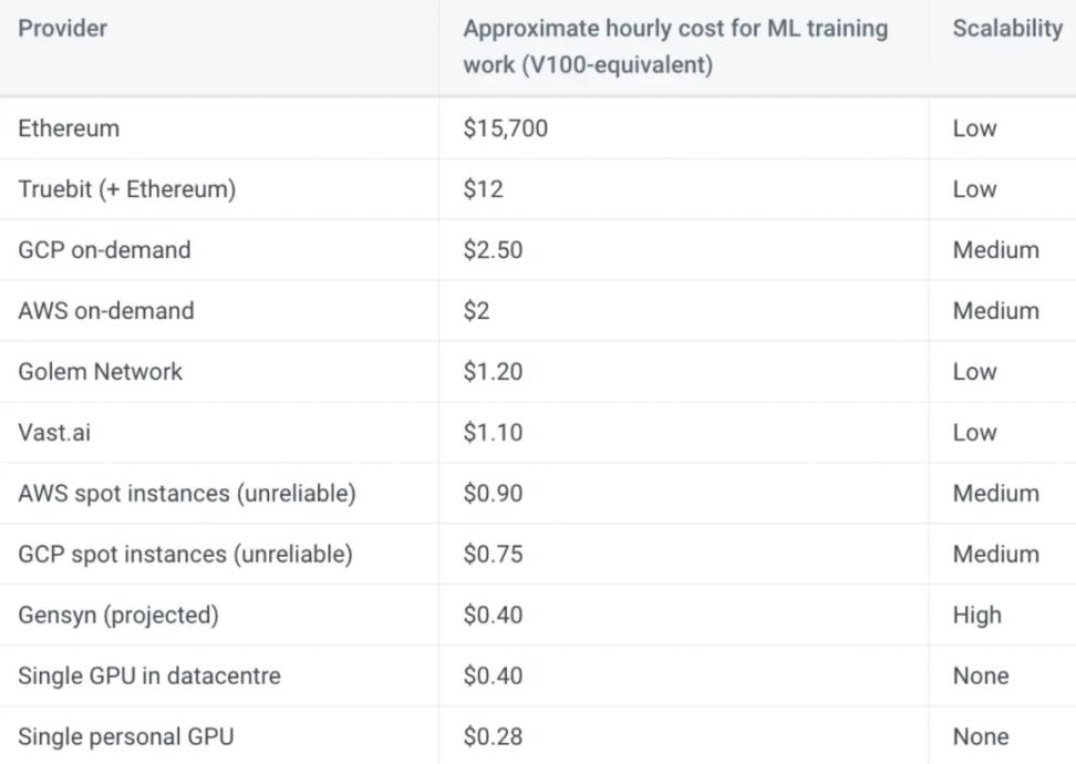 Although the Gensyn network is not live yet, the team predicts an hourly cost of about $0.40 for a V100-equivalent GPU on its network. This estimate is based on Ethereum miners earning $0.20 to $0.35 per hour using similar GPUs prior to Merge. Even if this estimate were off by 100%, Gensyn's compute costs would still be significantly lower than the on-demand services offered by AWS and GCP.