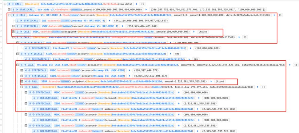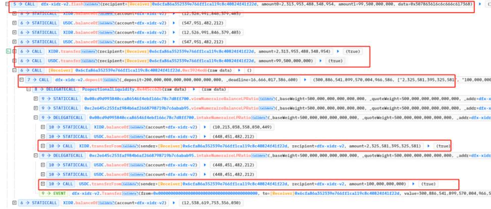 2. Call the flash function from the DFX contract to loan to UCDC and XIDR, and then call the deposit function to mortgage. When mortgaging, you can see that the money lent by the hacker is mortgaged back to the DFX contract.