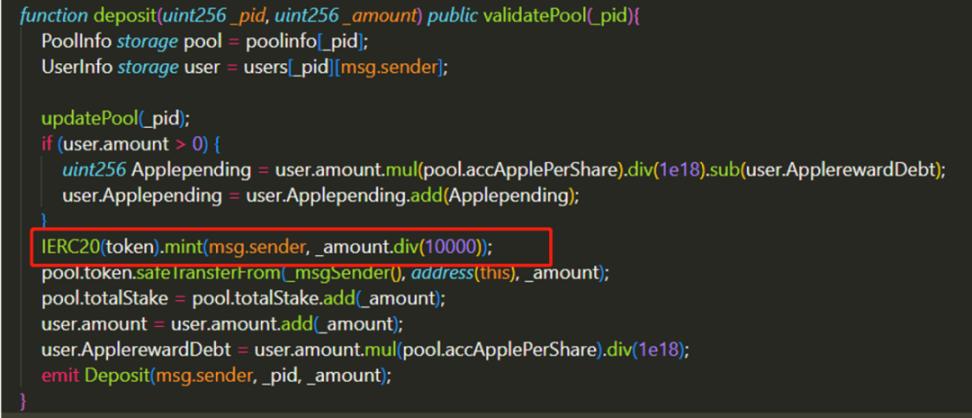 In this code, the contract will immediately return the reward to the user's address according to the amount of mortgage. We have already mentioned the problem here, and it is relatively easy to think about. If there is no delay in the distribution of rewards, the Flash Loan money can be rewarded only for a moment after being pledged in the contract, which is undoubtedly a huge arbitrage loophole.