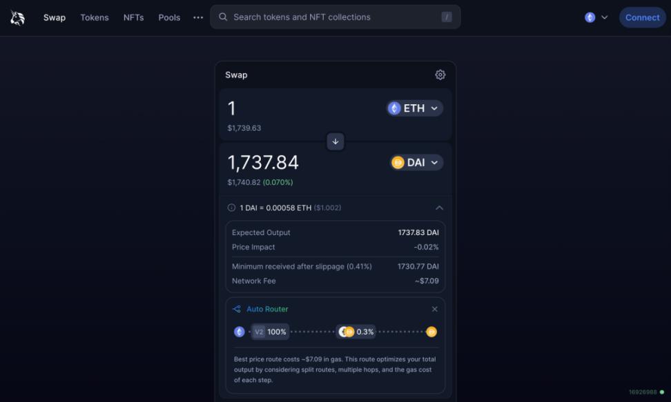 Uniswap is one of the most popular decentralized exchanges in DeFi. The way for general users to access Uniswap is the web interface. For example, the figure below shows the exchange of ETH-DAI. We call an exchange between two tokens a trading pair.