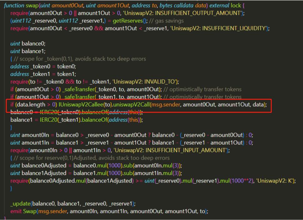 And in the two lines above the red box, we see that there are two transfer functions. As the comment says, this is an "optimistic transfer" - that is, a transfer without checking whether it is paid or not. In the last part, after calling the user contract, the swap() function will slowly require the payment amount.