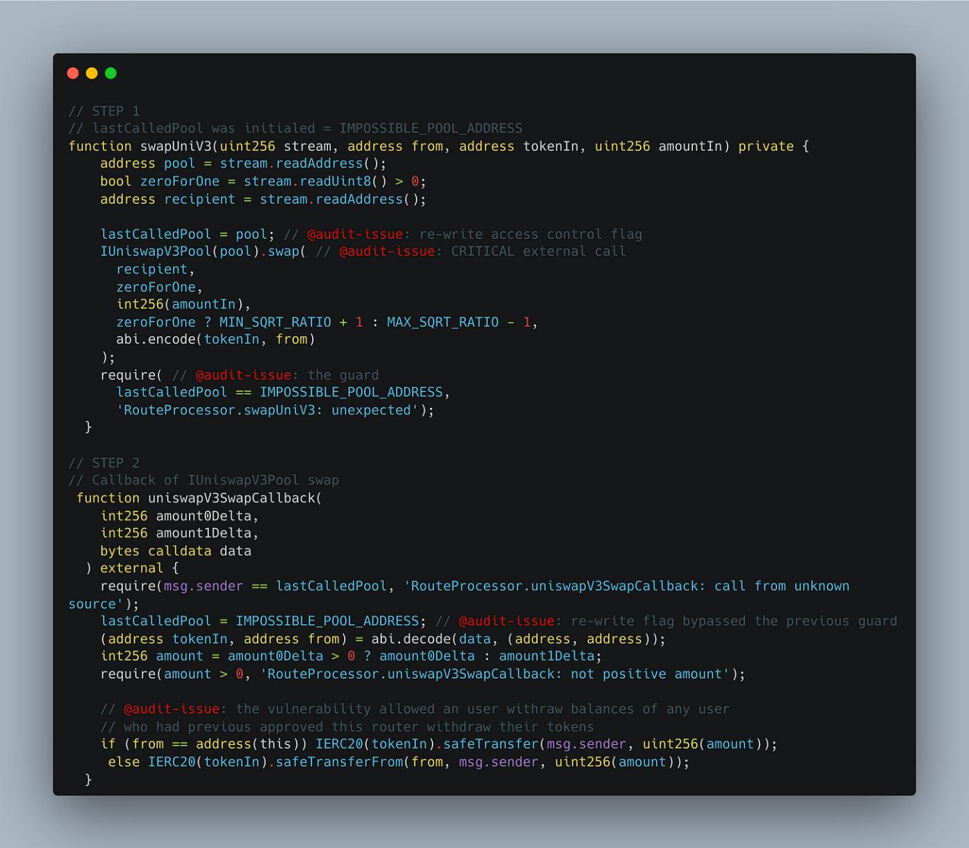 Last week, the DeFi market suffered 2 major hacks with the first one costing $3.3 million on Sushi Swap, a well-known decentralized exchange. The vulnerability was found in the RouteProcessor2 contract, which includes a function called processRoute that handles off-chain generated routes for swapping tokens.