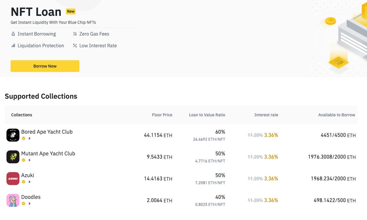 Binance’s NFT lending service is launching with an inaugural collection of blue-chip NFTs such as BAYC, MAYC, Azuki & Doodles. LTVs range from 40-60% at interest rates of ~3.4%.