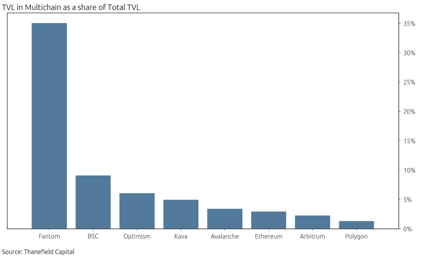 As a bridging protocol, some L1s & L2s are more severely exposed to Multichain: Fantom is the most exposed with 35% of its TVL being locked on Multichain, followed by BSC (10%) and Optimism (8%).