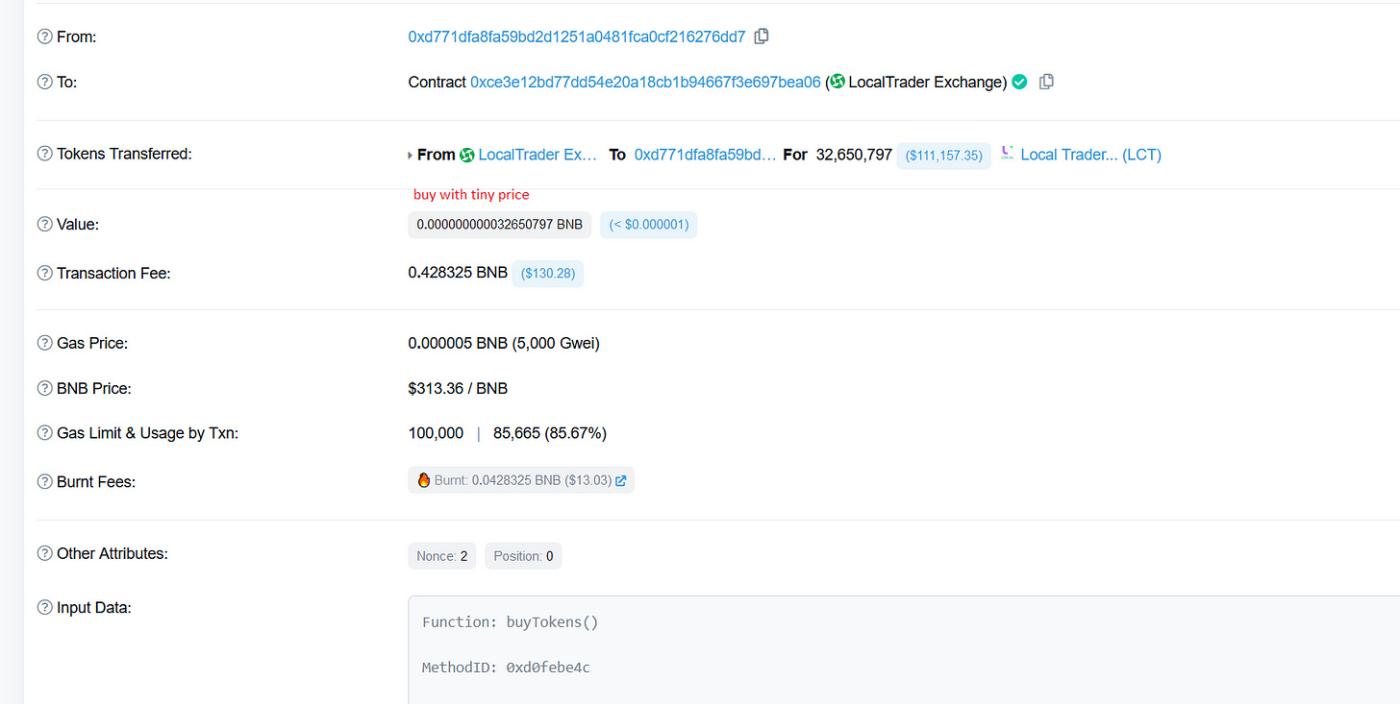 With the price set to 1, the attacker likely bought a significant amount of $LCT tokens at a reduced price. After acquiring these tokens, they then sold them at a higher price, making a profit from the price discrepancy. The platform had since patched the vulnerability in a newly deployed staking contract.