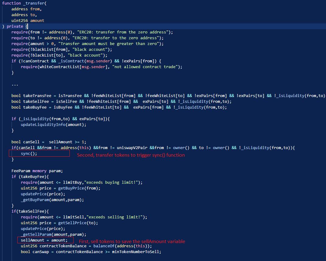 During a recent attack, the $CS token on BSC suffered a hack resulting in a loss of $714,000. The attack was made possible by exploiting a vulnerability related to the sellAmount global variable within the _transfer function. This variable was not promptly updated, allowing the attacker to manipulate the token contract.