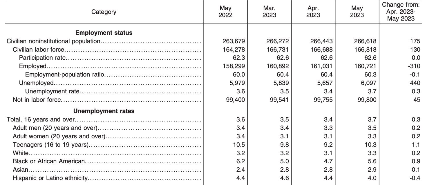 The May jobs report is out. 339K jobs were added in May vs. 195K expected. The unemployment rate inched up to 3.7% in May, up from 3.4% in April . The labor force participation rate was 62.6% in May, unchanged from April but still below the February 2020 level of 63.3%. Average hourly earnings rose 0.3% MoM and 4.3% YoY, still way above the 2% inflation rate the Fed targets.