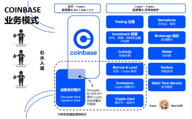 After "leading water into the channel", Coinbase provides investors with one-stop full-lifecycle Crypto services, such as Crypto trading (traditional exchange business), Crypto Derivatives trading (Derivatives futures business), financial product investment (broker business), Brokeage brokerage business (brokerage business), Crypto institutional custody business (bank trust business), Crypto payment settlement business (financial payment business), Venture venture capital business (asset management business). Investors can also enter DEX, DeFi, NFT, GameFi and other scenarios through Coinbase's self-hosted Wallet wallet.