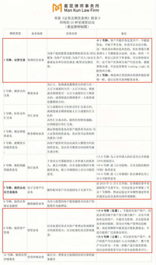 Compared with the large and comprehensive ecological positioning of Coinbase in the United States, as well as many "corresponding" regulatory frameworks, the current new VASP system in Hong Kong is only for the CEX platform for the time being. If a market only has platforms and customers, it will not be possible to form a prosperous and diverse ecology, so we also need to bring in services such as asset management and investment consulting. The prosperity and development of the Hong Kong Web3 virtual asset market must be inseparable from the support and guidance of traditional finance. The following will further clarify the compliance path for traditional finance to enter the Hong Kong Web3 virtual asset market by sorting out the 10 types of financial regulatory licenses of the Hong Kong Securities Regulatory Commission (SFC) (compiled by Shanghai Mankiw Law Firm).
