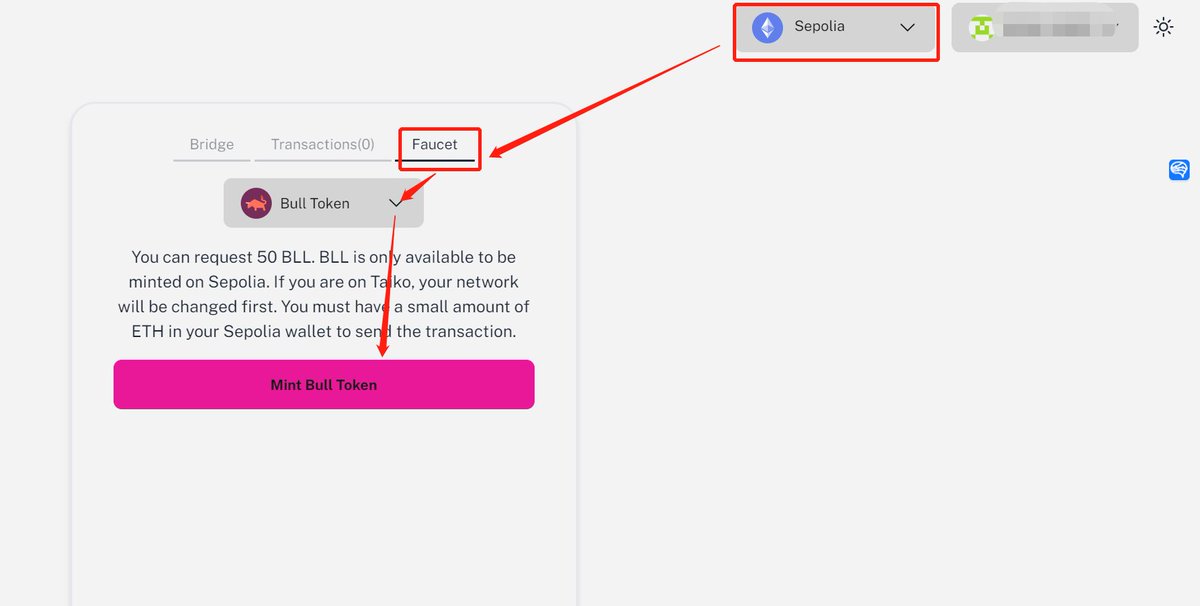 - Go to bridge.test.taiko.xyz/#/faucet with wallet, switch to Sepolia testnet