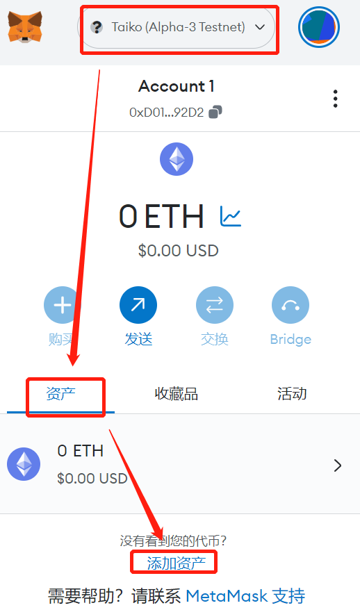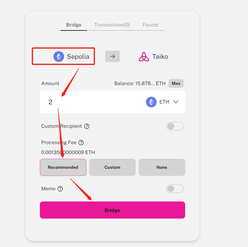 - Go to bridge.test.taiko.xyz/# with wallet, switch to Sepolia test network
