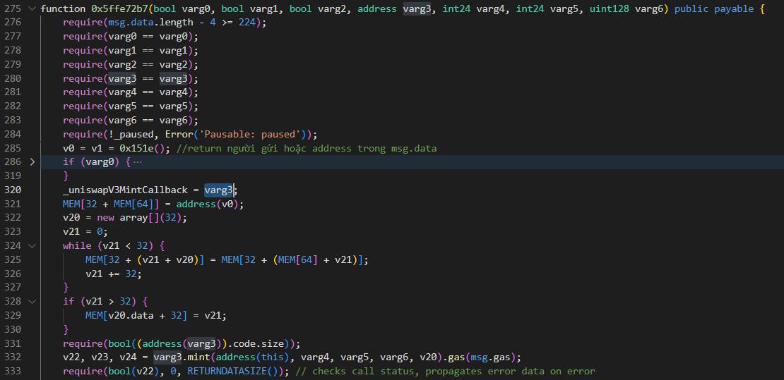 The attacker takes advantage of the vulnerability by defining two functions, namely mint() and token1(). The token1() function retrieves the tokens that the victim has approved for this contract, indicating what tokens the victim allows the contract to manage on their behalf. The mint() function is called when users add liquidity to the pool through the function 0x5ffe72b7. Inside mint(), the attacker introduces a callback function called "uniswapV3MintCallback," and manipulates the transferFrom function to direct tokens from the victim (sender) to the attacker's address (recipient). As a result, the attacker can maliciously control the minting process and siphon tokens from unsuspecting users to their own addresses.