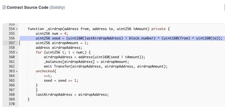 In a series of attacks, 4 consecutive projects were hacked using the same method with an accumulated loss of $230,000. In these projects, their smart contract contains an "_airdrop" function within the "transfer()" method to distribute tokens randomly to addresses. However, the method's lack of true randomness poses a significant vulnerability. The issue arises from the use of manipulable inputs like the last airdrop address, block numbers, and "from" and "to" addresses for generating random addresses. This predictability enables malicious actors to influence the airdrop outcome, leading to exploitation.