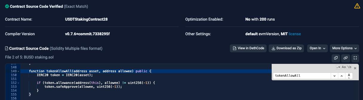 Last week, a contract named “USDTStakingContract28” was exploited for $21,000. It was found to lack sufficient restrictions on the "tokenAllowAll" function, which allows users to grant approval for transfers to any entity they control. This particular vulnerability poses a significant risk to the security and integrity of the contract. To mitigate potential exploits and ensure the system's safety, it is crucial to conduct a comprehensive security audit to identify and address any weaknesses or loopholes within the contract's codebase.
