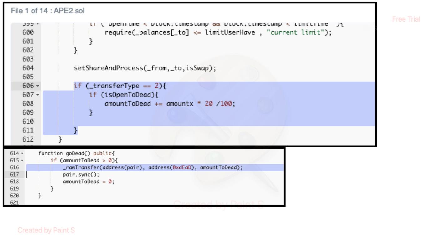 A token called $APEDAO was hacked for $7,000 due to a price manipulation attack. The attacker manipulated the price of the $APEDAO token in the pair contract by conducting repeated token transfers, exploiting the "skim" function to withdraw excess tokens, and burning a substantial number of $APEDAO tokens held in the contract.