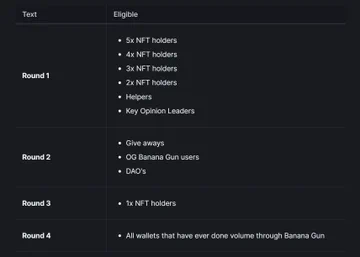 The pre-sale and opening of Banana Gun, my most optimistic project in the near future, pre-sale 800E, opening market value 1.56M, single wallet limit is 1ETH, the overall first-come-first-served mechanism is used, divided into 4 rounds, of which the first round will not exceed The last three rounds were all super serves, and it is expected to end in the second round. $tip @tipcoineth