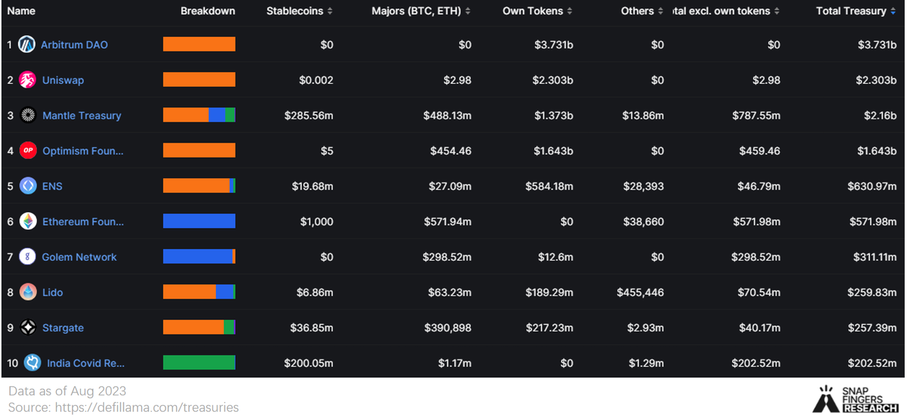 As can be seen from the figure below (the fund holdings of the top ten richest DAO organizations), although the treasury’s funds rank third among all DAOs, compared with the top two DAOs (Arbitrum DAO, Uniswap ), Mantle has a clear advantage. Arbitrum and Optimism's treasury is almost 100% owned by their own governance tokens, while ETH, USDC, and USDT account for 22.1% of Mantle's treasury. This determines that Mantle DAO will have stronger market-making capabilities than other DAOs and will also have more high-quality assets to support ecological development. These factors provide a more solid basis for MNT token valuation.