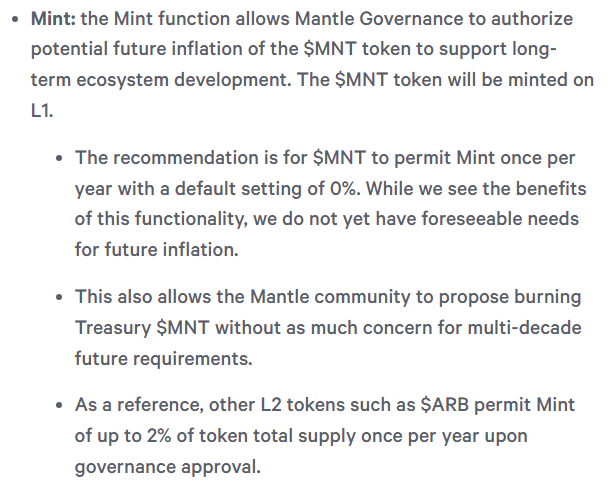 Referring to the ARB token model, the newly minted MNT tokens every year will not exceed 2% of the total supply.