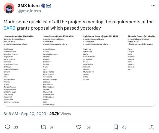 -Solid data/alfa on potential $ARB-grant recipients from @gmx_intern, top potential recipients are Curve, Synapse, Sushi, Balancer, Stargate, Aave, Radiant, Uniswap, and GMX: