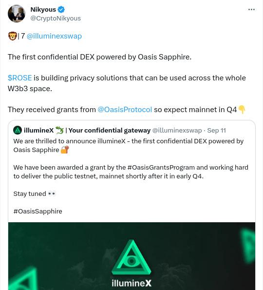 -New project called @illuminexswap. Twitter bio states “Confidential multichain DEX gateway powered by Oasis Sapphire technology 🏰 #OasisNetwork”. h/t @CryptoNikyous: