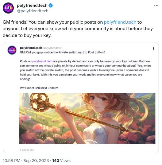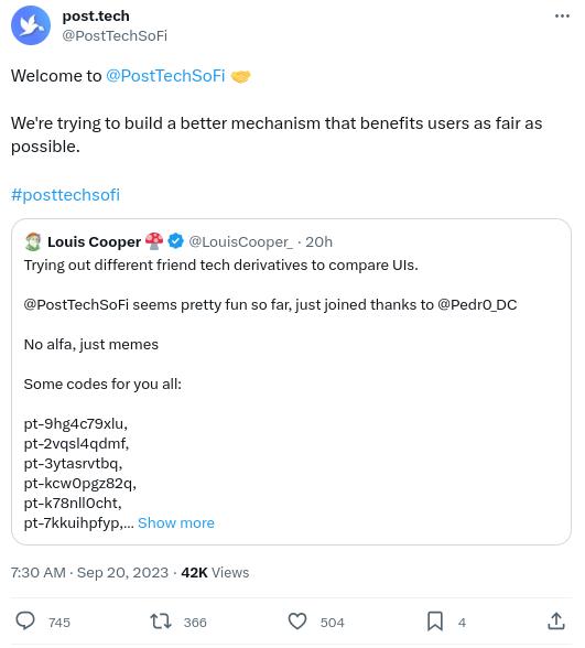 -New friendtech-alternative on Arbitrum called @PostTechSoFi. Twitter bio states “Web3 social network on Arbitrum, where profiles become assets and interactions turn into profits (💙,🧡)”.