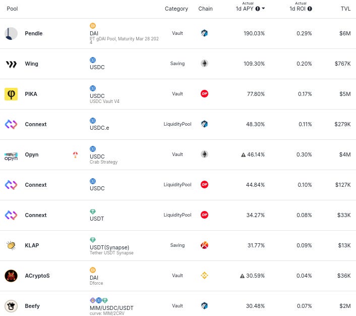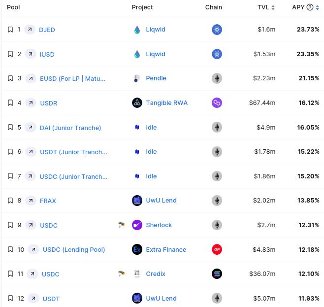 (note: these are the top Stablecoin Yields, sourced from @DefiLlama ($1M+ TVL, single-exposure and no-IL only) and @stable_fish - note: these lists are just raw data, make sure to always DYOR before interacting with any/all protocols)