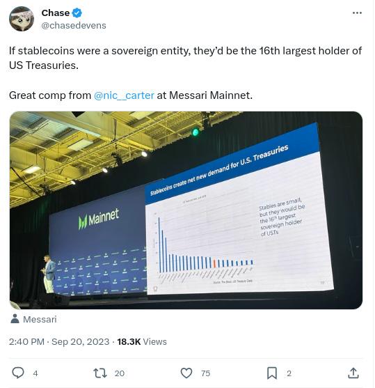 -Stablecoins now represent more treasury holdings than all but 15 countries, h/t @nic__carter c/o @chasedevens:
