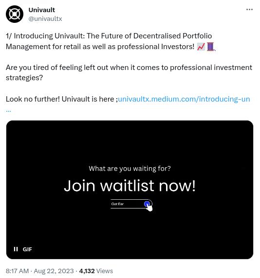 -New project called @univaultx. Twitter bio states “Decentralised Middle Layer For Social Trading With Comprehensive Automation and Third Party Tooling".