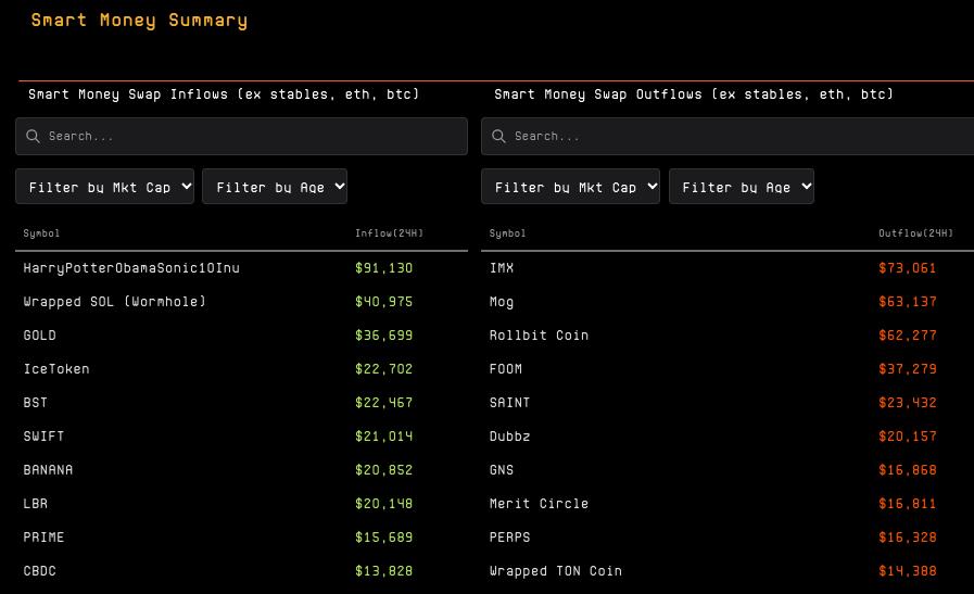 September 20, 2023 chainEDGE - Today's Summary Another slower day in terms of smart money activity. BITCOIN saw a reversal in sentiment today, with $91k of inflows. The last time the token saw this much smart money interest was on September 11th, which marked the local bottom in the token. Other smaller inflows were seen in new launch GOLD, along with ICE, BANANA and LBR. Outflows were seen in IMX, MOG, RLB, FOOM and SAINT. Tokens aged less than 2 weeks with sustained smart money holdings of $40k+ include APX, Tyrion, BANANA, Real Smurf Cat, Curve Inu and PROPHET. BANANA has also flipped UNIBOT in terms of smart money holdings, with $1.1mm across 38 wallets (also the highest smart money wallet count across all coins). Smart money has been buying the dip on BANANA, with $77k of gross buys / $21k net buys in the past 24 hours, at an average price of $9.91. Trader highlight of the day goes to 🚀 New Launch Pro 0x32d...77a who made $15k in realized gains on APX.