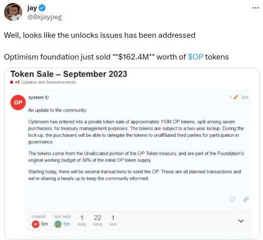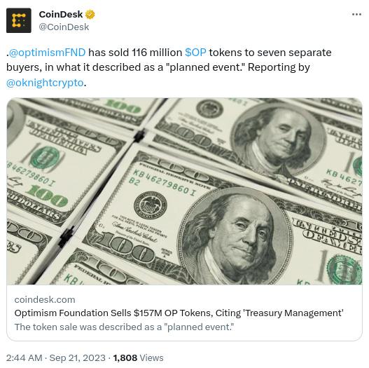 -Optimism Foundation reportedly sells 116 million OP tokens, h/t @CoinDesk and @0xjaypeg: