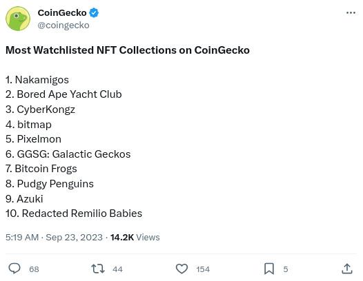 -Interesting tweet from @coingecko on most-watched NFT collections: