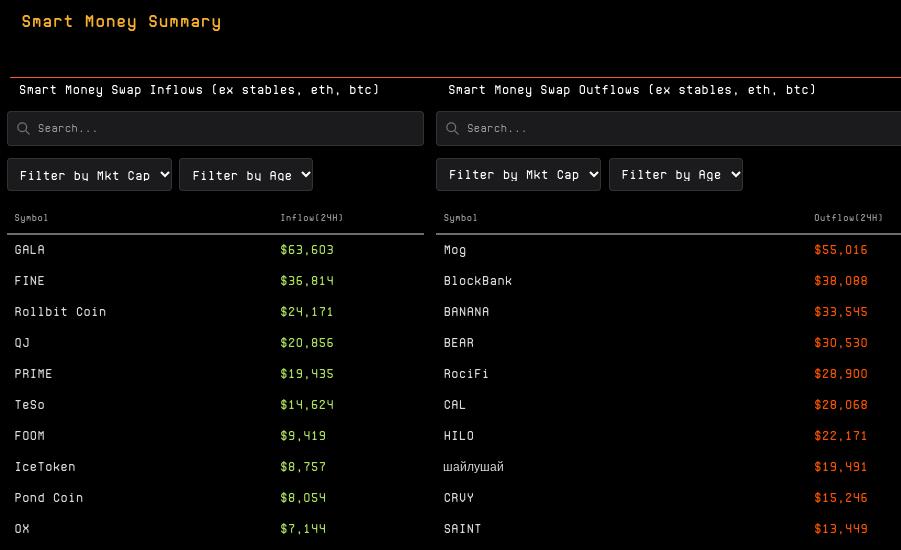 September 22, 2023 chainEDGE - Today's Summary Another slow day in terms of flows. Inflows were led by buys on GALA, FINE, FOOM, and RLB. Sells where seen in MOG, BlockBank and BEAR. There were also small buys on ICE (~$8k), which now has $292k of total smart money holdings. Interestingly, the largest smart holder (💎 Gem Spotter 0xf7b...1f1) owns $150k and has a very good track record ($375k PnL across fundamental projects like LVL, GRAIL and NEOBOT). We observed some abnormal dip buying in FINE from 💎 Gem Spotter 0x9f2...1b5, who scooped up $32k of the token. This trader has $546k in realized PnL over the last 6 months. From a new launch perspective, only MONKE has seen smart money retain their positions ($29k of buys / 46% still holding). Notable coins with over $100k of smart money holdings currently includes: CAL, BANANA, Real Smurf Cat, SHIA, LINQ, MOG, RLB, BITCOIN, UNIBOT, FOOM, OX, PEPE and PRIME. Trader highlight of the day goes to 🚀 New Launch Pro 0xf4e...56f who made $25k on CAL.