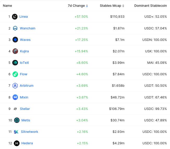 Here’s The Top 12 Chains By 7 Day Stablecoin Inflow % (from @DefiLlama):