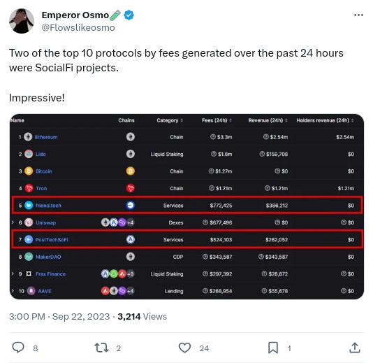-SocialFi continues generating intense discussion/use, h/t @Flowslikeosmo: