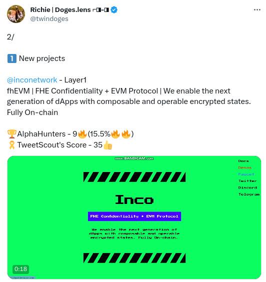 -New L1 called @inconetwork. Twitter bio states “fhEVM | FHE Confidentiality + EVM Protocol | We enable the next generation of dApps with composable and operable encrypted states. Fully On-chain.” h/t @twindoges: