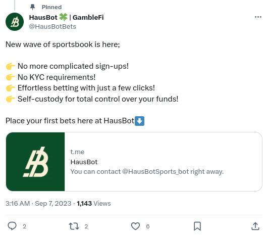 -New trading bot project called @HausBotBets. Twitter bio states “Bet easy and fair at your fingertips - on @Telegram & @Arbitrum 🏈🏀⚽️ Decentralized Sportsbook! 🏆”. h/t @brave_raf: