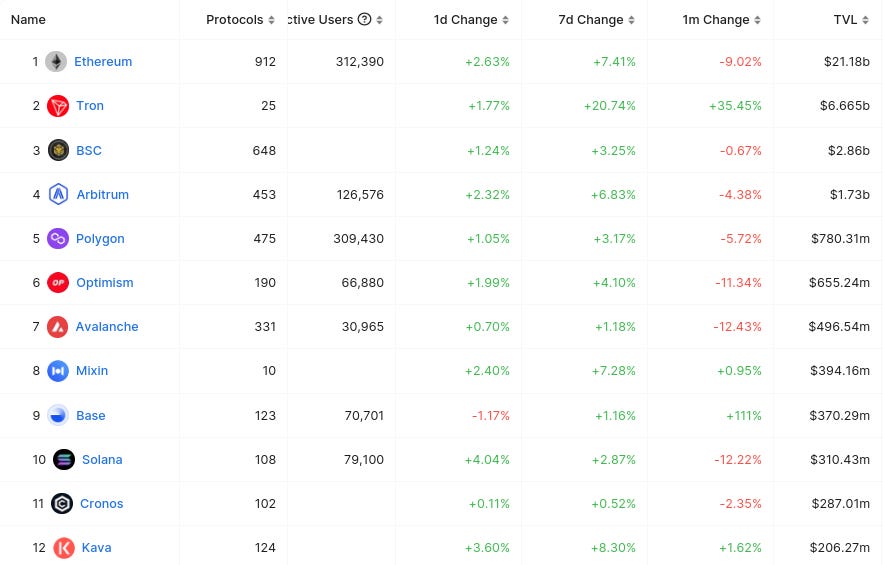 Chains are mostly green today. Chains with at least $10M TVL up at least 20% on the weekly include Kujira, Pulse Chain, TON, Tron, and Neutron.