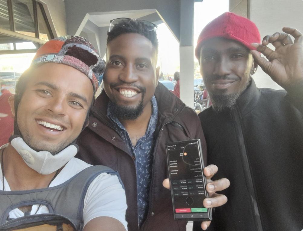 Ovidy has lived in the United States for decades and learned about Bitcoin as an undergraduate. After returning to Zimbabwe, he built a business with Bitcoin at its core. In the picture below, Ovidi (middle) takes a photo with Bitcoin traveler Paco (left):