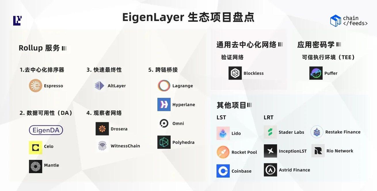 EigenLayer divides AVS into 5 types: Rollup service, applied cryptography, general decentralized network, MEV management, and AI inference. It has been more than half a year since the release of the EigenLayer white paper. During this period, many AVS have been built on EigenLayer infrastructure. This article will take stock of EigenLayer's ecological projects and explore early Alpha opportunities.