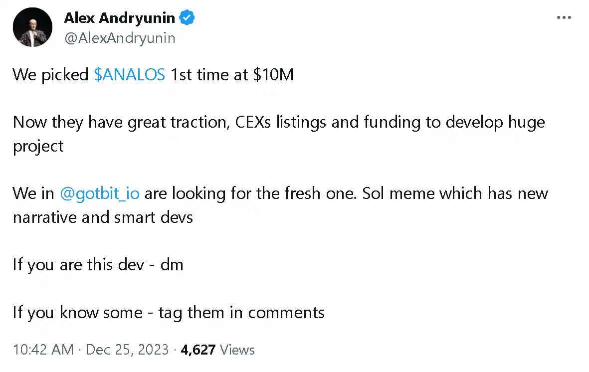 Gotbit said that while holding ANALOS, it "will support the project to achieve broader market expansion." Therefore, community members speculated that Gotbit may assist ANALOS in listing on CEX, or even "replicate" the development path of BONK. When Alex Andryunin responded to the mention of ANALOS, he also hinted that ANALOS will follow in the footsteps of BONK.
