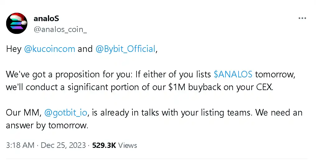 In addition, ANALOS is undergoing an airdrop, with a total of 15 billion ANALOS tokens available for eligible users, namely the top 30% of Solana DEX users; the top 100,000 BONK holders; Tensorians, SMB, Mad Lads, Claynosaurz , Okay Bears and FFF NFT holders. Currently, ANALOS is using the $1 million investment received from Gotbit for its Christmas buyback campaign.