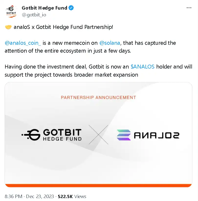 On December 23, the hedge fund Gotbit Hedge Fund officially announced its cooperation with analos and stated that it already holds ANALOS. The US$10 million in market-making funds provided by this hedge fund has led to the rapid rise in the market value of ANALOS, which is undoubtedly an important step in igniting community enthusiasm.