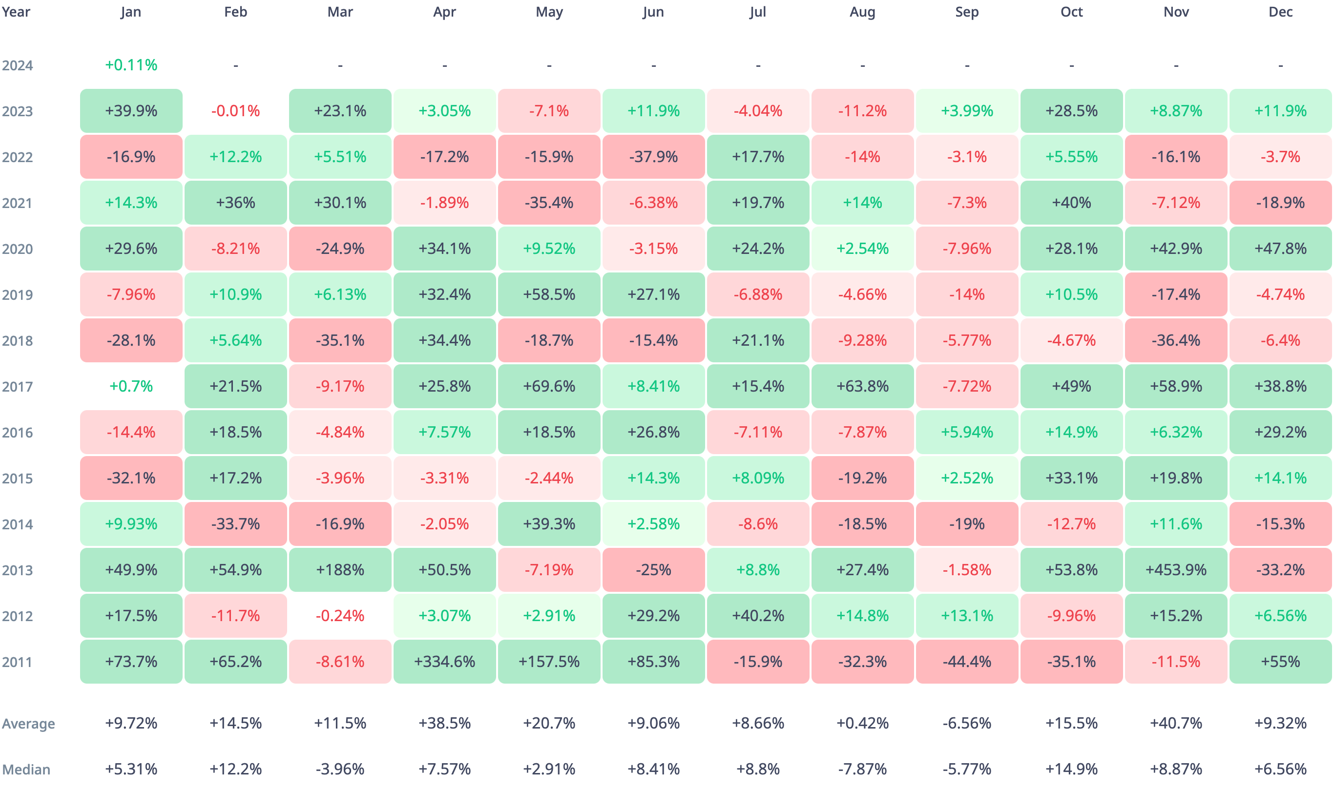 Looking back over Bitcoin's 14-year history, January has generally been a month of positive returns. Since 2011, Bitcoin has averaged a 10.5% return in January. While 13 years of data may not be comprehensive, it's enough to bolster the confidence of crypto investors, despite the notorious unpredictability of cryptocurrencies.