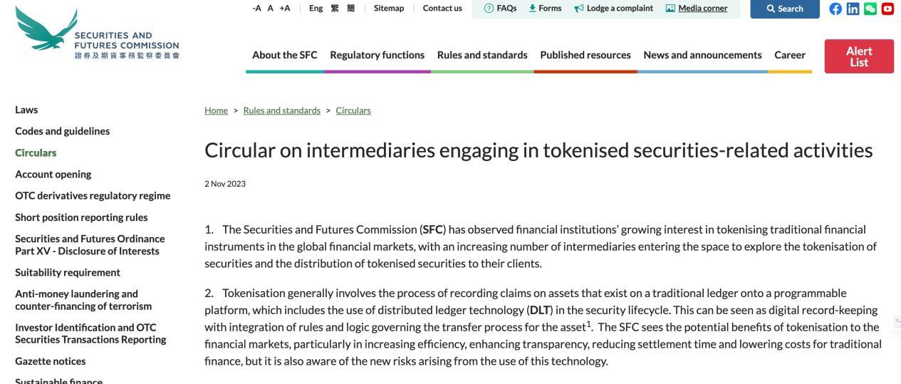 In early November 2023, Hong Kong SFC issued a circular on tokenized securities.
