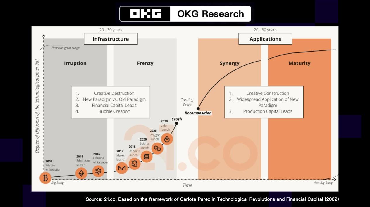 Based on the Carlota Perez framework, 21.co believes that crypto is transitioning from a frenzy to a synergy phase.