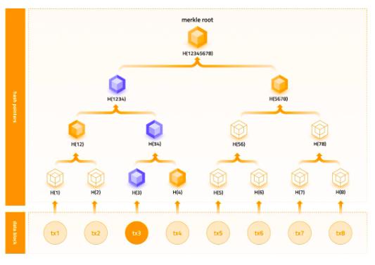 reveal: Prover reveals the value corresponding to a leaf node, such as tx 3, and its branch (H( 4) -> H( 12) -> H( 5678)).