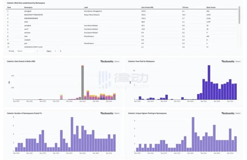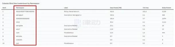 @astroglyph_io, the inscription service that allows users to publish arbitrary data to Celestia · @MantaNetwork, the OP Stack rollup started with @Calderaxyz · 808080808080808, an unknown namespace but looks like a rollup