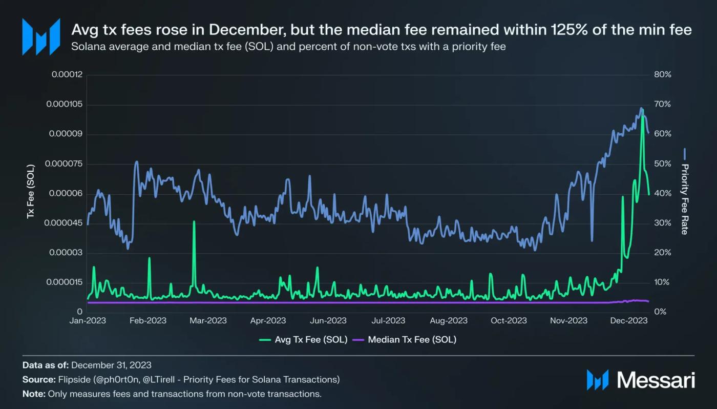 Increased on-chain activity in December 2023 spurred more transactions, including priority inclusion of fees, so average transaction fees increased by 175% month-on-month to 0.000025 SOL ($0.002 USD). Daily priority rates reached a yearly high of nearly 69% on December 26, while average daily transaction fees peaked at 0.001 SOL on December 27, which was 4 times the average fee in Q4 2023 and was 11 times the average fee in the third quarter.