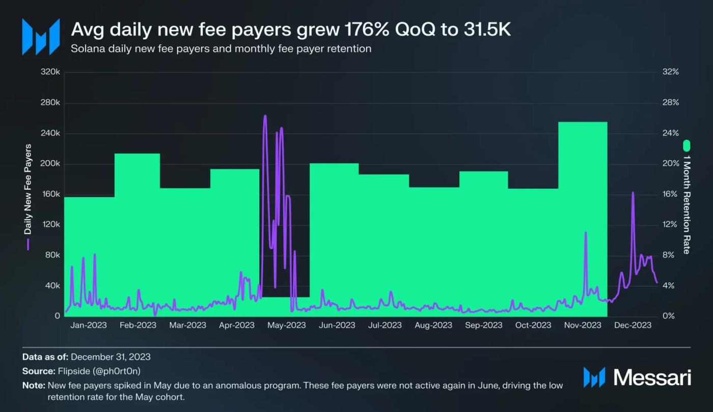 New paying subscribers followed a similar growth trend, reaching a new yearly high, ignoring unusual activity in the second quarter. The average daily number of new paying users increased by 176% month-on-month and 88% year-on-year, reaching 32,000. The one-month retention rate of the new paying user group in November 2023 is Solana's highest figure in the entire year of 2023, reaching 25.6%.